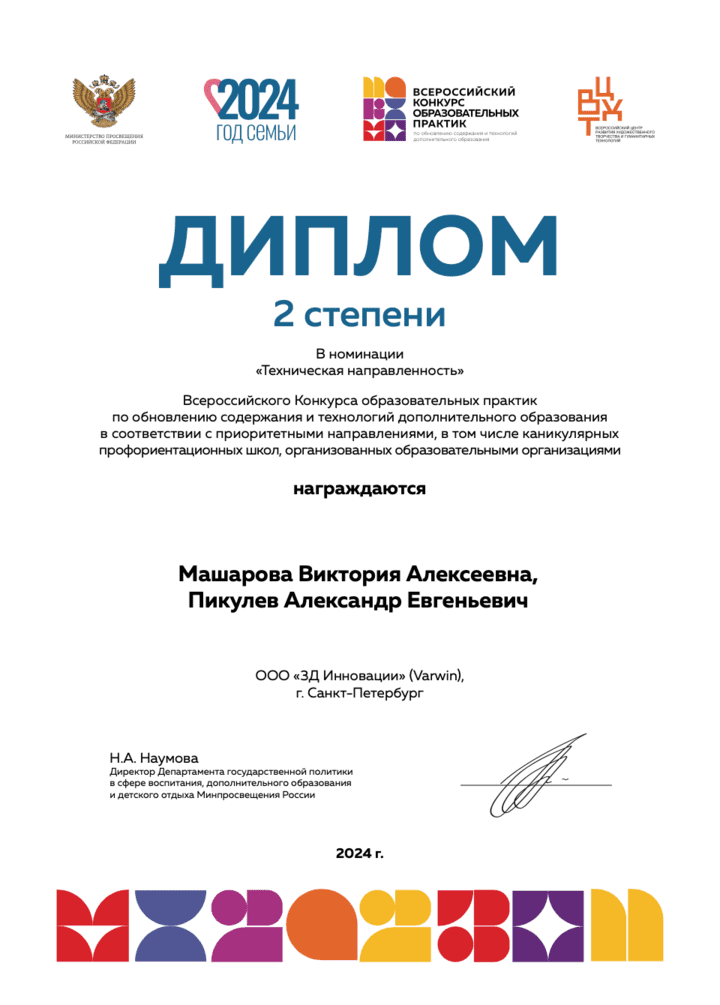 Благодарим Викторию Машарову и Александра Пикулева за разработку учебно-методического комплекса и за ценный вклад в развитие виртуальной реальности в образовании. Наш УМК был высоко оценен жюри и занял II место в номинации «Техническая направленность»!