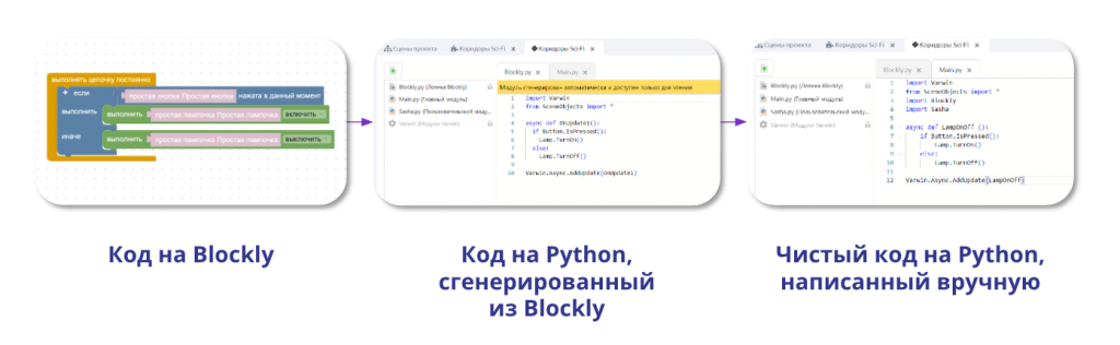 Теперь на Varwin появилась возможность не просто писать код на одном из самых популярных в мире языков программирования Python, но еще конвертировать созданный Blockly в читаемый код Python, что сильно упрощает образовательный процесс в области перехода от визуального программирования к коду. И все это с учетом объектной модели Varwin, где каждым объектом теперь можно управлять прямо из кода", — Семен Луканов, основатель Varwin, CPO.